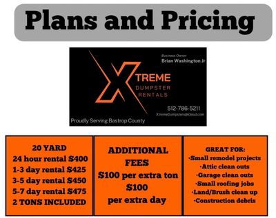 We offer dumpster rental services for construction sites, with a range of sizes to meet your needs. Our dumpsters are durable and weather-resistant, and we'll deliver and pick up the dumpster at a time that works for you. We also offer flexible rental options to fit your budget. rent a dumpster Bastrop Tx, Cedar Creek Tx, LaGrange Tx, Smithville Tx, Giddings Tx,15 yard dumpster, 20 yard dumpster, 30 yard dumpster, Roll off Dumpster.